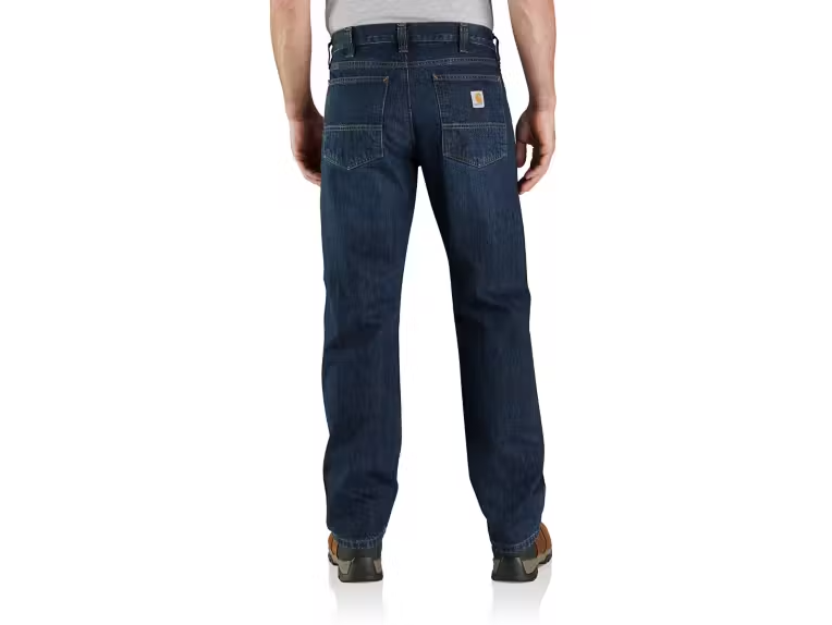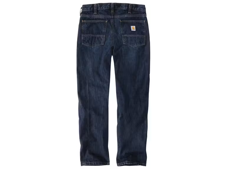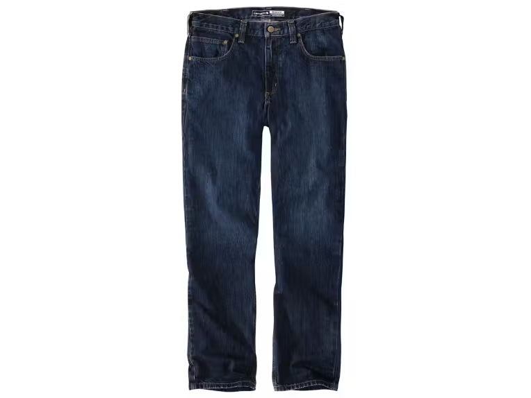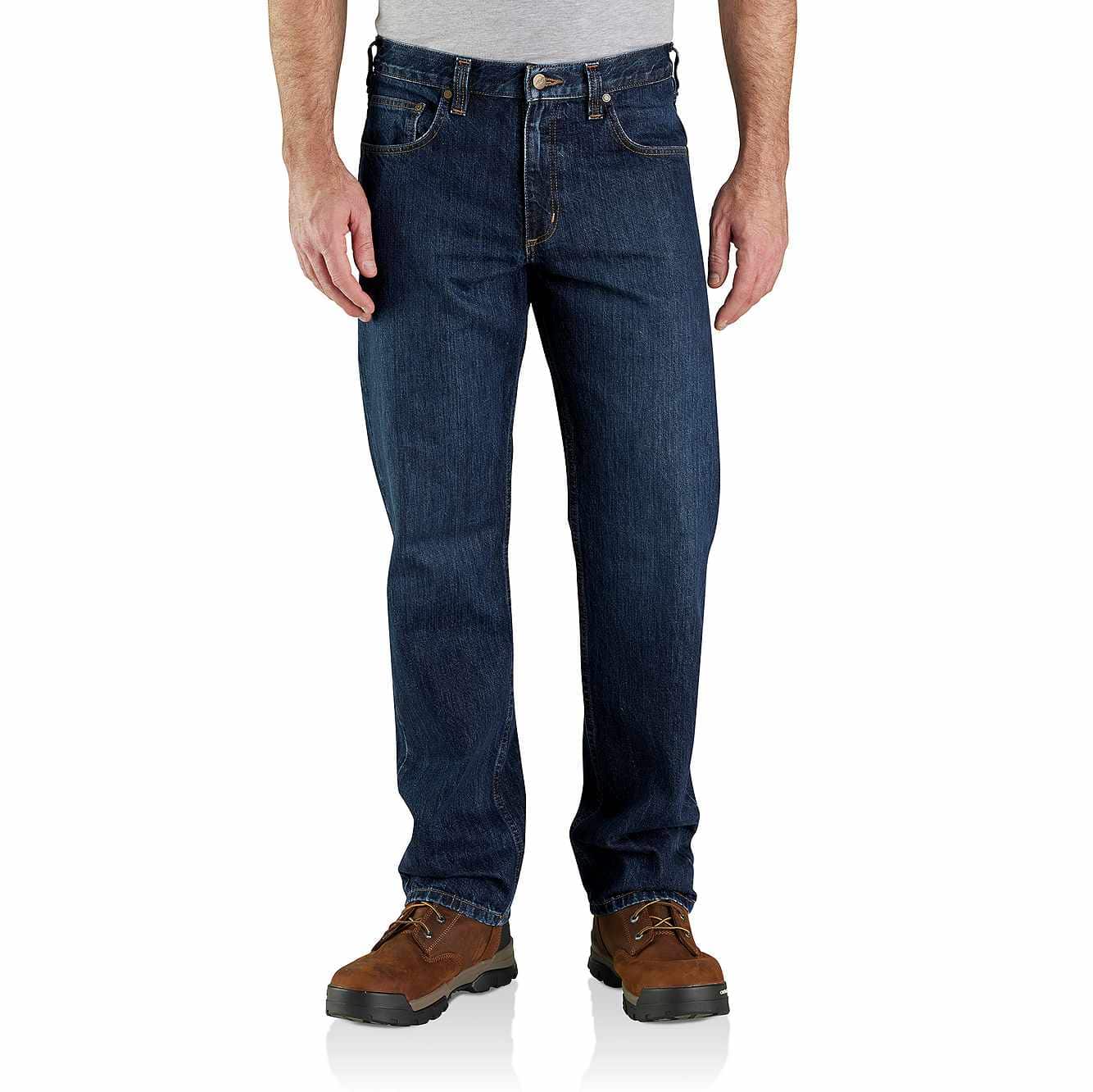 Midweight canvas gives these men's Carhartt five-pocket jeans their work day durability. Hardworking crews appreciate the relaxed fit with a little extra room through the seat and thigh for a good range of motion. Straight leg design fits over most work boots. Denim is pre-washed with a process that uses 60% less water than traditional methods and no bleach.